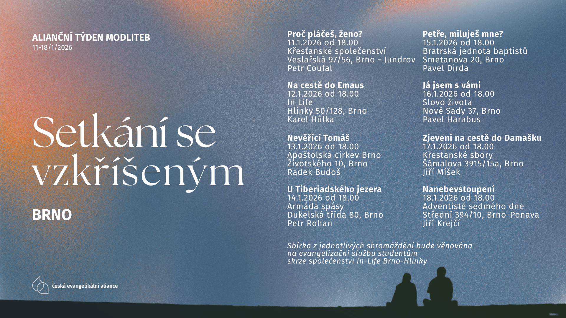 různé církve v Brně BrnoAlianční týden modliteb (ATM) 2026 přináší téma „Setkání se vzkříšeným“ – příběhy lidí, kteří se po vzkříšení setkali s Ježíšem, nám ukazují, jak Bůh vstupuje do chvílí, kdy jsme bezradní, zranění nebo plní pochybností. Jsou to okamžiky, kdy Kristus přichází a dává se poznat – často úplně prostě, u jídla, na známých cestách, v rozhovoru. […]