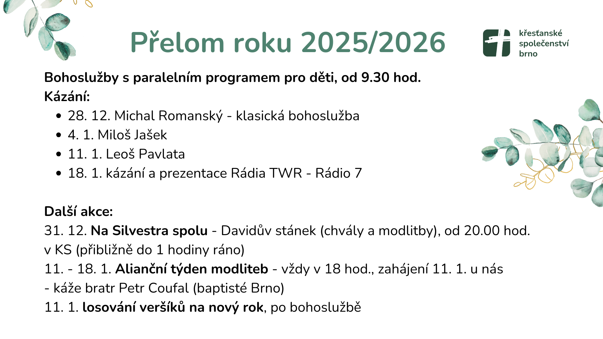 Rádi byste vstoupili do nového roku s chválou na rtech? Máte důvody k vděčnosti a rádi byste je sdíleli s druhými? Nechcete být na Silvestra prostě sami? Přijďte mezi nás na poslední Davidův stánek roku 2025.
